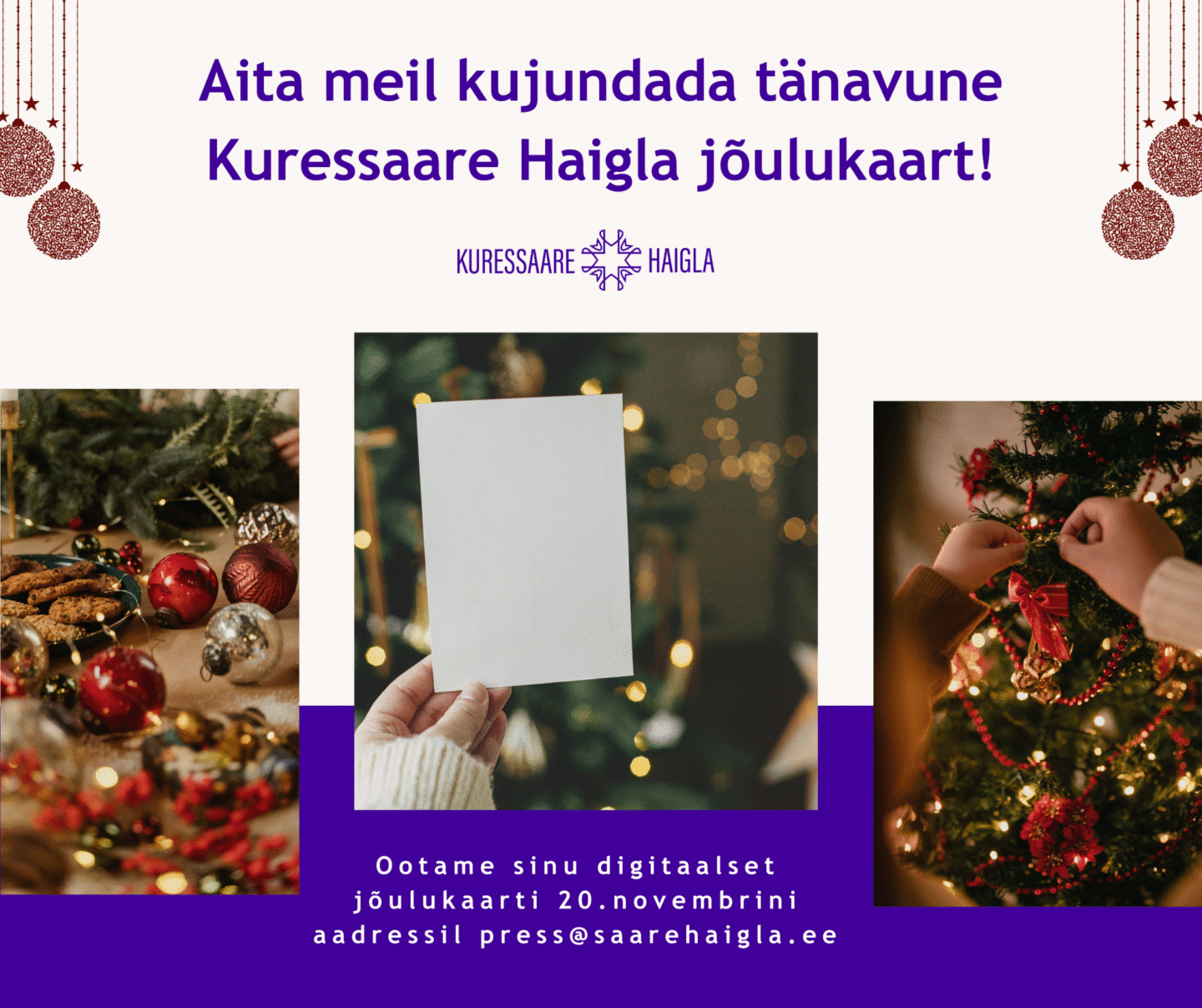 Kuressaare Haigla hakkab vaikselt sättima eesootavaks jõulukuuks ning mõtlesime, et sel aastal teeme asju jälle natuke teistmoodi. Igal aastal oleme muidu ise kujundanud Kuressaare Haigla digitaalse jõulukaardi, mida saata enda headele koostööpartneritele. Sel aastal kaasame protsessi terve kogukonna! Oled Sa noor või vana, omad kogemusi kujundamises või ei – ootame Sinu nägemust Kuressaare Haiglale sobivast jõulukaardist 20. novembriks meiliaadressile press@saarehaigla.ee. Lisa kindlasti juurde autori nimi ja kui tegu lapsega, siis ka vanus.