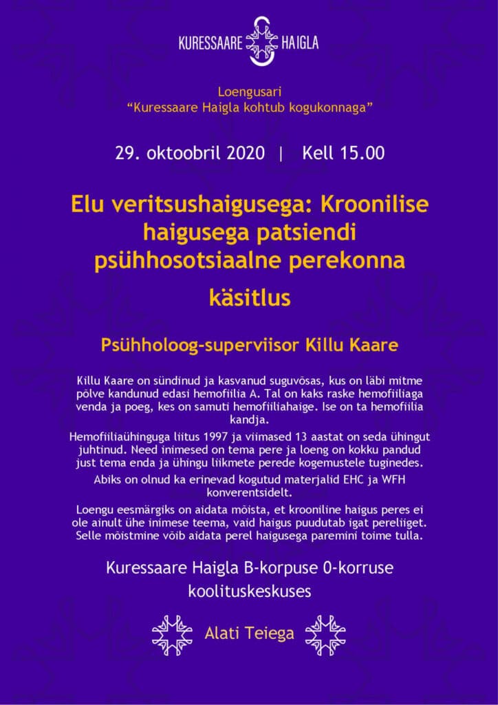29. oktoobril, 2020 kell 15.00 toimub loeng „Elu veritsushaigusega: Kroonilise haigusega patsiendi psühhosotsiaalne perekonna käsitlus”. Lektor: Killu Kaare. Psühholoog-superviisor. Killu Kaare on sündinud ja kasvanud suguvõsas, kus on läbi mitme põlve kandunud…