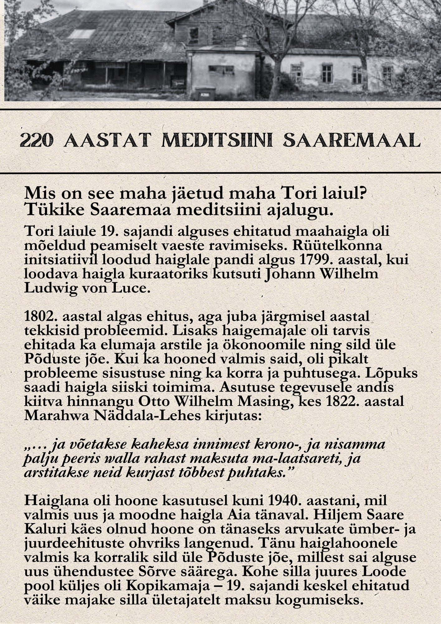 Kas teate, head saarlased, et käesolev aasta on ehk natuke erilisem, sest just sel aastal möödub 220 aastat Saaremaa Maahaigla avamisest. Seda arvestatakse ka Kuressaare Haigla algusajaks, mis siis, et aastaid hiljem haiglahoone Tori laiu pealt Aia tänavale ümber koliti. Niisiis saab 2024. aastal natuke nostalgitseda ja ajaloos ringi sobrada, uurida Saaremaa meditsiiniajalugu ning tegelikult ka pisut mõtiskleda selle üle, kust me oleme tulnud ning kuhu omadega jõudnud. Ja ehk annab see tuult tiibadesse edaspidiseks, et meil kõigil säiliks sihikindlus oma praeguste küngaste ja mätaste ületamiseks. Nagu ajalugu näitab, oleme neid künkaid-mättaid pidi juba vähemalt 220 aastat ringi kolistanud ja ikka rajal püsinud.