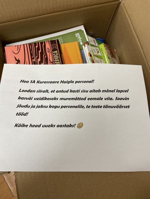Meie psühhiaatriaosakonna üleskutse läks saarlaste seas korralikult lendu ning nüüdseks võime tõesti öelda, et oleme saanud kõike, mida vähegi üks hing ihaldada võiks. Suurim tänu teile, armsad inimesed! Oma panuse andis eraldi veel ka Kuressaare Hariduse Kool, kus heatahtlike ja tublide õpetajate eestvedamisel sai kogutud terve hulk lauamänge ja muud põnevat. KHK HEV-ainekomisjoni esimees Kätlin Hommik kirjutas: “Kingu õppehoone õpilaste täidetud mänguasja-pusle-raamatukott lohises nädala alguses Kuressaare Haigla psühhiaatria osakonda. Ta oli ikka hirrrrrrrrrrrrmus raske, nii et personal tegi teda vastu võttes väga suured silmad. Sama suur kui mitte suurem oli ka nende siiras tänu. Nüüd oleme tõesti pikaks ajaks varustatud ning rõõmsad teadmises, et meie kogukond on tugev ja abivalmis ning saame teineteise peale alati loota. :)