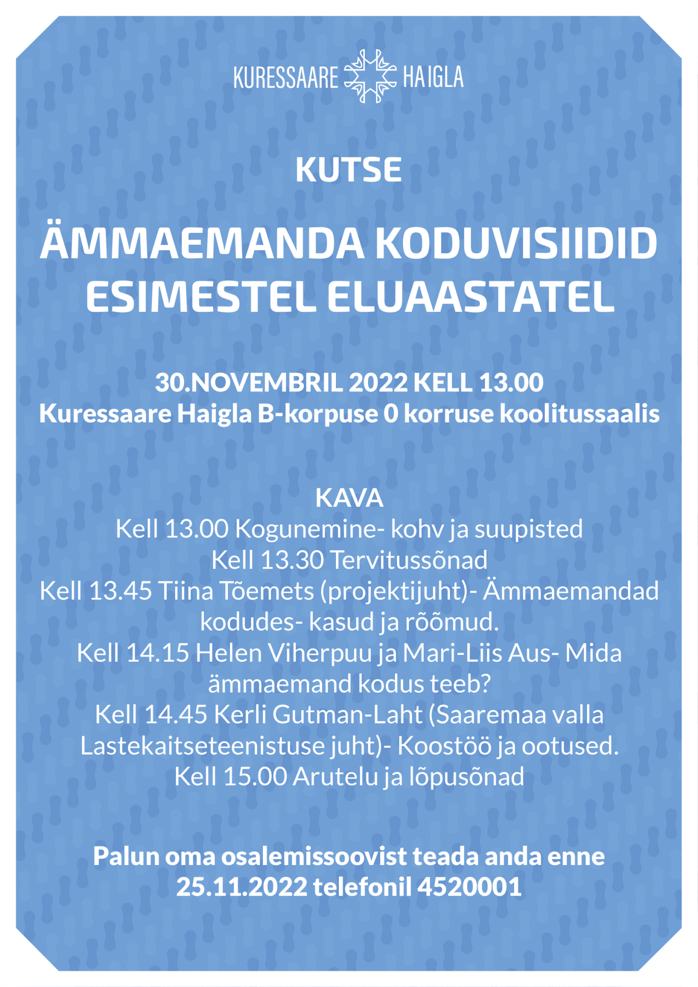 Head saarlased! Meie kodukäijad- ämmaemandad kutsuvad kõiki huvilisi 30. novembril kohtumisele, kus räägime ämmaemandate koduvisiitidest! Hea võimalus saada hea ülevaade olulisest teenusest, mida kohapeal kasutada saame, esitada küsimusi ja tutvuda näost-näkku nende inimestega, kes on ämmaemandate perede kõrval nende elu ilusamatel, aga sageli ka teadmatust, hirmu ja ebakindlust täis hetkedel.