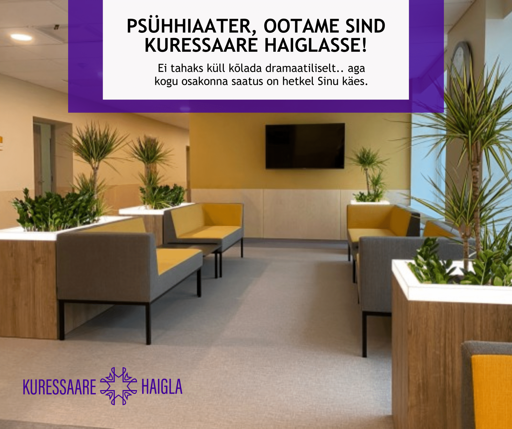 Selleks, et tööle asumist ja tööl käimist hõlbustada, on siin käimist võimalus kombineerida kaugtööga – viibida kolm päeva kohapeal ja kaks päeva juhtida osakonda kaugtööna. Garanteerime psühhaatrile väärilist tasu ja Saaremaal elukohta mitteomavale töötajale kompenseerime elamiskulud ja transpordi.